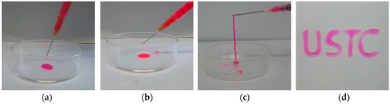 Since the Schiff base reaction between PEG-DTP and ADA can quickly establish chemical crosslinks to form the hydrogel network (Figure 1), the injectability of the PEG-DTP/ADA hydrogel was shown in Figure 5. ADA solution and PEG-DTP solution were in the liquid state when squeezed out (Figure 5a,b). The ADA solution and the PEG-DTP solution were mixed together in a syringe and the gel was formed in situ when squeezed out. For better injectability, the gelation time of the injectable hydrogel should be controllable. The gelation time of the ADA/PEG-DTP hydrogels can be easily controlled due to the pH sensitivity of the Schiff base reaction. As depicted in Table S2, gelation time measured by vial inversion test [26] at different pH values (3.0, 5.0, 7.0) were 10 s, 60 s, and 1.5 h. Namely, the gelation time of the hydrogel can be tuned over a wide range by changing the pH. Figure 5d shows that the PEG-DTP/ADA hydrogels can be squeezed as bio-ink to write the word “USTC”. Together with the tunable gelation time, the PEG-DTP/ADA hydrogel is also a promising candidate as a 3D printing hydrogel.