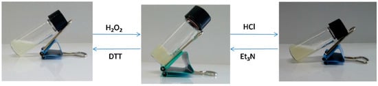 The reaction between the –NH2 groups of PEG-DTP and the –CHO groups of ADA formed the pH-sensitive acylhydrazone bonds, and the disulfide linkage in PEG-DTP were responsive to reductants (DTT or GSH). Thus, the dual responsive properties were displayed in our PEG-DTP/ADA hydrogel system. Acylhydrazone bonds could break at low pH and reform at high pH, while disulfide linkages could break in reducing environments and reform in oxidizing environments, thus the hydrogel exhibited dual sol-gel transitions. Vial inversion tests [26] were used to monitor the gel–sol-gel transition. As shown in Figure 6, the hydrogel turned into the sol-gel state by adding hydrochloric acid solution to turn the pH to 1. Then, when triethylamine was added to change the pH to 7, the hydrogel was reformed again. Furthermore, the sol-gel transition was also observed by the triggering of redox stimuli (DTT/H2O2). The hydrogel turned into the sol-gel state when adding the reductant, DTT, and recovered the hydrogel network after adding the oxidant, H2O2 (Figure 6). The dual sol-gel transitions indicated that the PEG-DTP/ADA hydrogel has excellent stimuli-responsiveness.