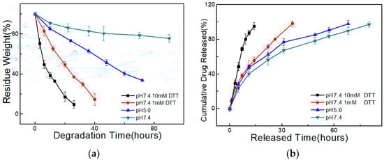 For injectable hydrogels, controllable degradability is of high value for drug release. Due to the stimuli responsiveness, the PEG-DTP/ADA hydrogel exhibited intriguing pH/redox triggered degradation. Reductants, such as DTT and glutathione (GSH), could break the disulfide crosslinking and hasten the degradation of the hydrogel network. As shown in Figure 8a, the weight loss of the PEG-DTP/ADA hydrogel (Gel20-3) was only 20 wt % in 3 days in pH 7.4 PBS solution. While immersed in DTT solutions for 26 h, the hydrogel showed almost 90% weight loss in 10 mM DTT solution and 63% weight loss in 1 mM DTT solution. The obviously different and accelerated degradation rate verified that the hydrogel’s degradation ratio can be easily controlled by varying the concentration of DTT. Besides, since acylhydrazone bonds were cleavable under acidic conditions, the degradation of PEG-DTP/ADA hydrogel could be triggered by varying pH. As shown in Figure 8a, the hydrogel showed a higher degradation rate at pH = 5, compared to pH = 7.4. Therefore, the degradability of the ADA/PEG-DTP hydrogel can be easily controlled by adjusting the DTT concentration or pH.