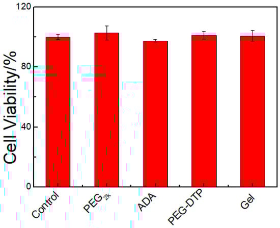 As it is well known that poly(ethyleneglycol) and sodium alginate are biocompatible polymers and are widely used in hydrogel preparation, the PEG-DTP/ADA hydrogels are supposed to be biocompatible. A549 cells were utilized to study the cell cytotoxicity of the hydrogel, and were analyzed by MTT assay [27]. The polymer solutions (PEG, PEG-DTP, and ADA) and hydrogel were used to test cell cytotoxicity. As shown in Figure 9, the A549 cells of PEG-DTP solution and ADA solution showed good viability (>90%) after incubation with the solution for 24 h. The results indicated that PEG, PEG-DTP, ADA, and hydrogel had good biocompatibility, confirming that the hydrogel is a good candidate for use as a drug carrier.