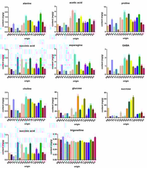Using the developed 1H-NMR method, 11 metabolites were determined simultaneously in 54 samples of mulberry leaves from 18 origins in China (Table S1 and S2), including standard material (SM) obtained from the National Institute for Food and Drug Control (Beijing, China), Pingyao (PY), Anyang (AY), Zhoukou (ZK), Suzhou (SZ), Bozhou (BZ), Guangzhou (GZ), Jinan (JN), Qingdao (QD), Linyi (LY), Heze (HZ), Zibo (ZB), Dezhou (DZ), Anguo (AG), Xingtai (XT), Chengde (CD), Daan (DA), and Fuzhou (FZ). As shown in Figure 3, all 11 metabolites were detected in the samples, except for asparagine that was absent in AY samples. Alanine in BZ, PY, XT and AY samples showed lower levels (0.13–0.39 mg/g) than those of SM (0.48 mg/g) and the other original samples. Acetic acid levels in BZ, FZ, XT, ZK and AY samples ranged from 0.87 mg/g to 1.46 mg/g, less than that of SM samples (1.48 mg/g), while acetic acid in the other origins were in range of 1.74–4.15 mg/g. Proline levels ranged from 3.48 mg/g to 11.71 mg/g, and only those of PY and AY were lower than the standard level (3.53 mg/g). Succinic acid in XT, CD, DZ, HZ, QD and ZB samples showed significantly higher levels (0.63–1.03 mg/g) than that of SM (0.39 mg/g), while BZ, FZ, PY and AY showed relatively low levels. A variation of asparagine from 0 mg/g to 1.30 mg/g was observed in AG, BZ, AY, PY, XT, CD and LY samples, which was much lower than those of SM and the other original samples. GABA in BZ, PY, XT, AY, QD and AG samples displayed lower levels (0.09–0.76 mg/g) than that of SM samples (0.80 mg/g), while GABA in the other origins ranged from 0.91–2.30 mg/g. Choline levels from most origins were higher than that of SM (0.97 mg/g) except the origins of BZ, PY, XT, AY, ZK and AG. Glucose and sucrose varied in wide ranges of 3.41–64.23 mg/g and 0.72–65.41 mg/g, respectively. Fumaric acid was detected in lower levels from FZ, AY, DA and SZ origins (0.05–0.19 mg/g) than the standard level (5.43 mg/g). Trigonelline varied in a range of 0.06–0.09 mg/g, which paralleled to that of SM (0.08 mg/g). These data indicated that the contents of 10 primary metabolites changed obviously with different geographical origins.