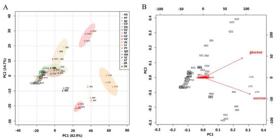 Scores plot (A) and biplot (B) of PCA model established with the quantitative NMR data.