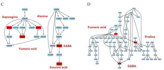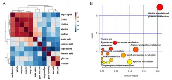 Correlation analysis showed an obviously positive relationship among asparagine, GABA, choline, alanine, and proline (Figure 5A), indicating they had a similar variation tendency. It was further confirmed by the results of pathway enrichment analysis that asparagine, GABA, alanine and proline were subjected to two pathways with high impact values (Figure 5B), including alanine, aspartate and glutamate metabolism (Figure 5C) as well as arginine and proline metabolism (Figure 5D). GABA as an intermediate in the two pathways, and our results suggested that inhibiting transamination of GABA might increase its yield in this plant.