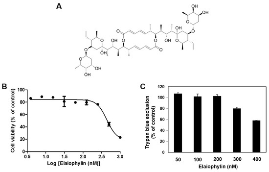 HUVECs were seeded at a density of 1 × 105 cells/well in gelatin-coated 12-well culture plate. Elaiophylin (50–400 nM) was added to each well and the cells were incubated for up to 72 h. After 72 h, the cells were stained with trypan blue (Sigma-Aldrich, Saint Louis, MO, USA) and counted with a hemocytometer. Cell viability was calculated as the number of viable cells divided by the total number of cells.