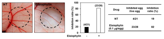 Fertilized chick eggs were maintained in a humidified incubator at 37 °C for 3 days. Approximately 6 mL of egg albumin was removed with a hypodermic needle, allowing the CAM and yolk sac to drop away from the shell membrane. After 2 days, the shell was punched out and peeled away. Thermanox coverslips (NUNC, Rochester, NY, USA) loaded with vehicle alone or elaiophylin were air-dried and applied to the CAM surface. Two days later, 2 mL of 10% fat emulsion (Sigma-Aldrich, Saint Louis, MO, USA) was injected into the chorioallantois, and the CAM was observed under a microscope.