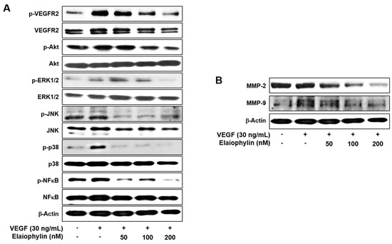 Matrix metalloproteinases (MMPs) are key players in the degradation of the extracellular matrix (ECM) during angiogenesis [19]. As shown in Figure 4B, elaiophylin suppressed the expression of endothelial cell-derived MMPs, including MMP-2 and MMP-9, in a dose-dependent manner. These data suggest that elaiophylin exhibits the antiangiogenic activity by blocking VEGFR2-mediated downstream signaling cascades in HUVECs.