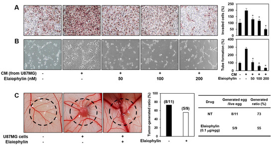 The effect of elaiophylin on the tumor cell-induced angiogenesis. (A,B) U87MG cells were treated with elaiophylin (50–200 nM) for 24 h, and then the conditioned media (CM) were concentrated by Amicon ultra centrifugal filters. The CM were used in the in vitro endothelial cell invasion (A) and tube formation (B) assays. The basal levels of the invasion and tube formation of HUVECs that treated the CM without U87MG cells were normalized to 100%. * p < 0.05 versus the CM from untreated U87MG cells. Each value represents the mean ± SE from three independent experiments. (C) The effect of elaiophylin on the tumor angiogenesis and growth of U87MG cells in the CAM model. Calculations were based on the proportion of tumor-generated eggs relative to the total number of live eggs. NT, not treated with elaiophylin.