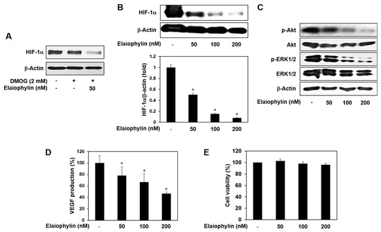 Hypoxia-inducible factor-1α (HIF-1α) has been known as the most potent inducer in the expression of VEGF and other angiogenic factors. In many cancers, HIF-1α is not only activated by low oxygen tension, but also amplified by a wide range of growth-promoting stimuli and oncogenic pathways. In particular, HIF-1α protein synthesis is increased via the activation of PI3K-Akt-mTOR or MAPK pathways [7,8]. U87MG cell line is glioblastoma with high expression level of HIF-1α under normoxia [20,21,22]. As shown in Figure 6A, HIF-1α expression levels under normoxia didn’t differ from those levels in the presence of DMOG, a prolyl hydroxylase (PHD) inhibitor, in U87MG cells. Elaiophylin inhibited HIF-1α expression even in the presence of DMOG, indicating that elaiophylin may affect HIF-1α protein synthesis. We thus evaluated the inhibitory effect of elaiophylin on HIF-1α expression of U87MG cells under normoxic condition. The treatment with elaiophylin dose-dependently inhibited the accumulation of HIF-1α protein (Figure 6B). Moreover, elaiophylin significantly suppressed the phosphorylation of Akt and ERK1/2 in U87MG cells, indicating that it may decrease the synthesis of HIF-1α protein through the downregulation of both PI3K-Akt-mTOR and MAPK pathways (Figure 6C). We further assessed the effect of elaiophylin on the expression of VEGF. Elaiophylin effectively decreased the VEGF production in U87MG cells, but didn’t inhibit the cell viability (Figure 6D,E). These data suggest that elaiophylin specifically represses VEGF release without exhibiting cytotoxic effect on U87MG cells. Collectively, elaiophylin might suppress tumor angiogenesis via the downregulation of HIF-1α and VEGF expression.