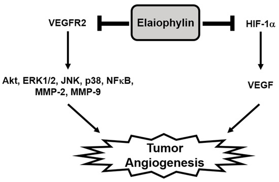 We demonstrate potent antiangiogenic effect of a natural compound elaiophylin both in vitro and in vivo. Elaiophylin not only downregulated VEGFR2-mediated signal transduction in endothelial cells, but also expression of HIF-1α in tumor cells, leading to suppression of tumor angiogenesis. Based on this study, elaiophylin may be used as a potential antiangiogenic agent for cancer therapy.