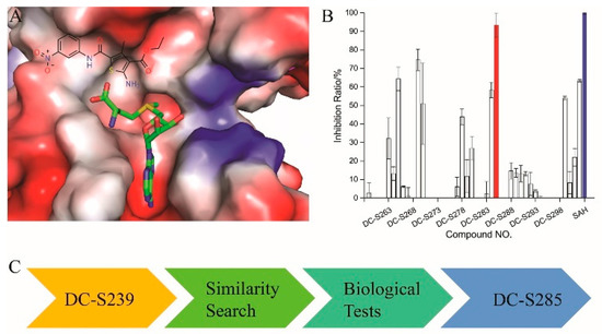 The flowchart of the combinatorial scaffold hopping and 2D fingerprint based similarity search strategies. (A) Chemical structure of DC-S239 and its predicted binding mode. DC-S239 is shown in sticks and the SET7 protein is shown in electrostatics surface; (B) Inhibition ratio of the compounds in first-round similarity search. DC-S285 is shown in red while the reference compound SAH is depicted in blue; (C) Workflow chart in the study.