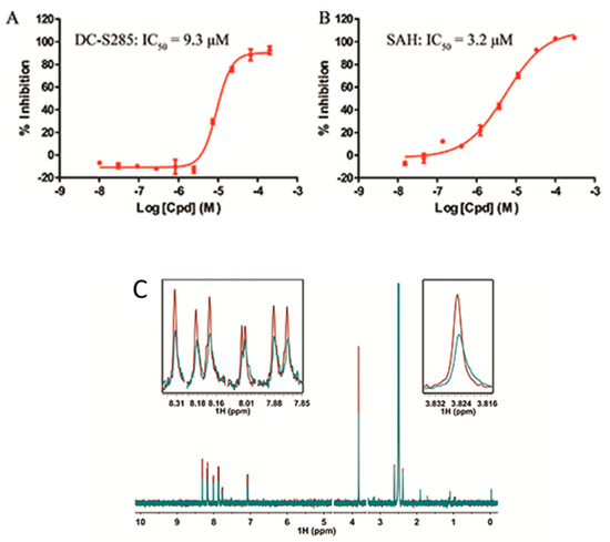 Activity of DC-S285 and of ligand observed 1D NMR experiments. (A,B). Inhibitory activities of DC-S285 and its reference compound SAH based on the AlphaLISA assay; (C). Carr-Purcell Meiboom-Gill Pulse Sequence reveals that DC-S285 binds to SET7. T1ρ spectra acquired by using DC-S285 (colored in red), 20 μM DC-S285 in the presence of 2.5 μM protein (coloured in blue).