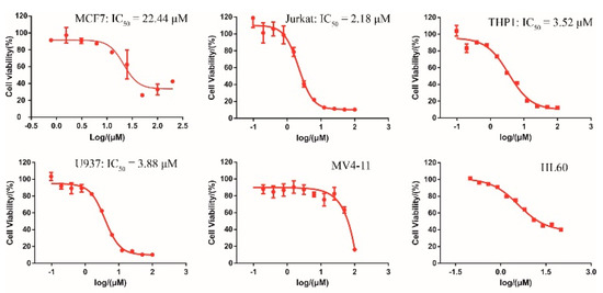 MCF7, HL60, MV4-11, K562, Kasumi-1, U937, THP1, and Jurkat cell lines were purchased from American Type Culture Collection (Manassas, VA, USA). Fetal bovine serum was purchased from Life Technologies. MCF7 cells were cultured in DMEM medium supplemented with 10% fetal bovine serum at 37 °C in an incubator with 5% CO2 atmosphere. HL60 and MV4-11 cells were cultured in 1640 medium supplemented with 10% fetal bovine serum. K562, Kasumi-1 and HL60 were cultured in 96 plate at 10,000/well for 2 h. DC-S285 was dissolved in DMSO (Sigma) and then stored at 4 °C. The cells were incubated with DC-S285 at different concentrations ranging from 0 to 100 µM for approximately 72 h. The activities of DC-S239 against MCF7, HL60, MV4-11, K562, Kasumi-1, U937, THP1, and Jurkat were measured by the alamarBlue assays and MTT assays.