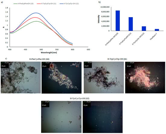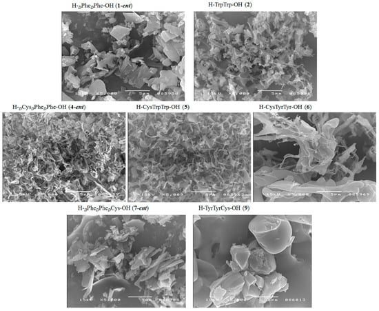 | H–PheCysPhe–OH (10) | + | + | +/− cluster of fibrous and amorphous structures |