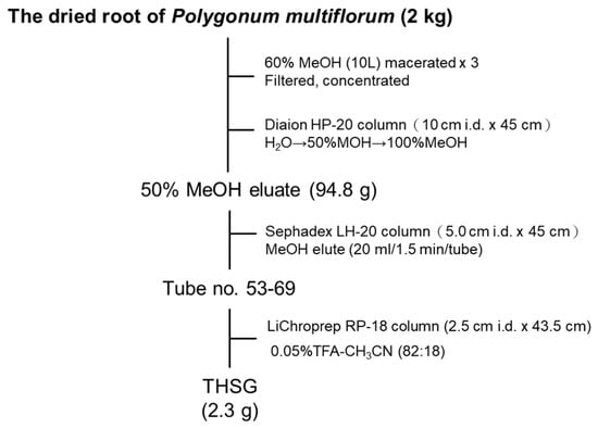 Dried slices of roots of PM (2 kg) were pulverized and soaked in 60% methanol (10 L) for one day. After being filtered, the residues were twice extracted with 60% methanol (10 L). The filtrate was combined and concentrated under a vacuum with a rotary evaporator to obtain an aqueous solution. The aqueous solution was chromatographed on a Diaion HP-20 column (10 cm i.d × 45 cm, Mitsubishi Chemical Industry, Tokyo, Japan) eluted with H2O, 50% MeOH, and 100% MeOH (each 5 L). The 50% MeOH eluate (94.8 g) of the Diaion HP-20 column was chromatographed over a Sephadex LH-20 column (5.0 cm i.d. × 45 cm, GE Healthcare Biosciences, Uppsala, Sweden) eluted with MeOH (20 mL/1.5 min/tube) to give a THSG-enriched fraction (tube no. 53-69). The THSG-enriched fraction (5 g) dissolved in water was chromatographed on a LiChroprep RP-18 column (2.5 cm i.d. × 43.5 cm, Merck, Darmstadt, Germany) eluted with 0.05% trifluoroacetic acid–CH3CN (82:18) to give an amorphous powder of THSG (2.3 g). The purity of THSG was 98.7% determined by HPLC (Waters 1525 binary pump connected with 717 plus autosampler and 2487 dual λ absorbance detector, Waters, Milford, MA, USA). A flowchart of THSG isolation is shown in Figure 2. The structure of THSG (Figure 1) was identified by comparison of its 1H and 13C nuclear magnetic resonance (NMR), (Bruker Avance DRX 500MHz, Bruker Corp., Billerica, MA, USA) data with those reported in the literature [16].