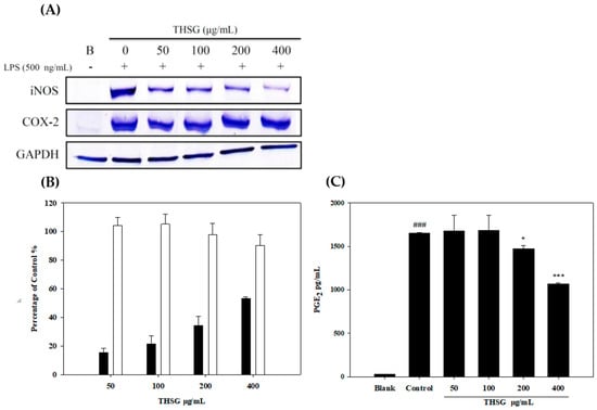 Anti-inflammatory of 2,3,5,4′-Tetrahydroxy-stilbene-2-O-β-d-glucoside (THSG) on lipopolysaccharide (LPS)-stimulated RAW 264.7 cells after treatment for 6 h. iNOS and COX-2 protein expressions (A); ■ NO production inhibition rate of THSG and ☐ cell viability (B); PGE2 production level (C), #: control group as compared to blank group, ### p < 0.005. *: TSHG group compared to control group, * p < 0.05, *** p < 0.005.