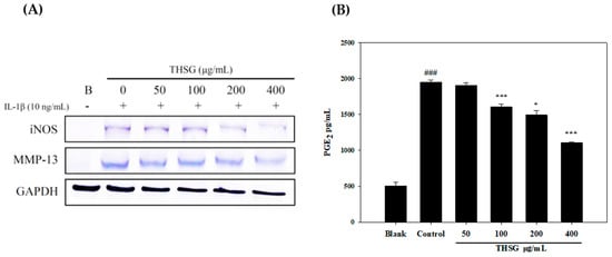 Effects of 2,3,5,4′-Tetrahydroxy-stilbene-2-O-β-d-glucoside THSG inhibited iNOS and MMP-13 expression on IL-β induced primary rat chondrocytes (A); PGE2 production level (B), #: control group compared to blank group, ### p < 0.005; *: THSG group compared to control group, * p < 0.05, *** p < 0.005.
