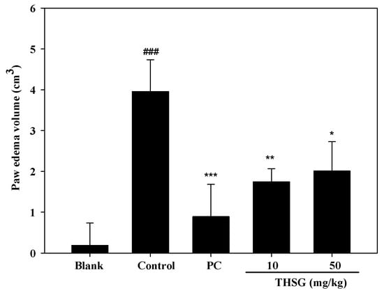 Five groups of eight male Wistar rats each were divided as follows: blank, control group, positive control group (PC), and THSG groups. Male Wistar rats were induced twice by intra-articular injections of 50 μL of 80 mg/mL MIA (Sigma, St. Louis, MO, USA) into the ankle using a 100-μL syringe (Figure 8). Rats were randomly divided into eight animals per group. After the MIA injection, the THSG groups were orally administered 10 or 50 mg/kg THSG daily for seven days. The PC group was treated with 2.5 mg/kg indomethacin daily for 7 days.