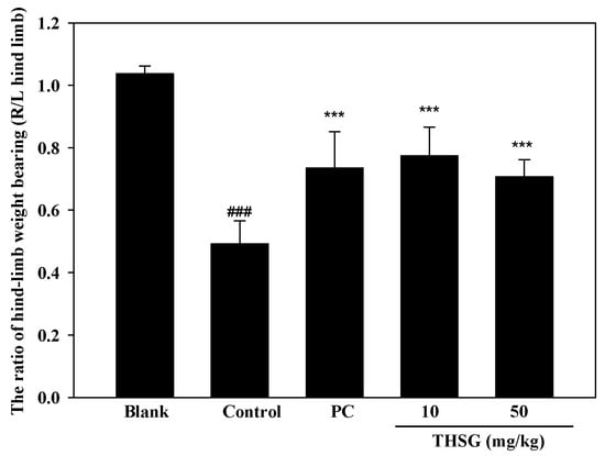 The anti-OA effect of THSG was examined using an MIA-induced OA model in Wistar rats. The model included two stages of arthritis: inflammation and pain. Paw edema was induced by an MIA injection into the right-hind ankle of each rat on day 0. Paw volumes were first measured before the MIA injection on day 0 as the baseline, and then measured a second time on day 2. The increase in the paw volume was calculated by the difference in paw volumes on days 0 and 2. The swelling volume of the paw significantly increased in the control group, and this indicated that an inflammatory response had occurred in the rats. Both THSG and indomethacin markedly reduced paw edema when compared to the control group (Figure 6). Paw edema had recovered by day 6 after the injection, which indicates that inflammation had entered the pain stage. Therefore, an incapacitance tester was used to measure the distribution ratio in hind-limb weight-bearing. The weight-bearing distribution on day 7 in rats was measured with an incapacitance tester for the distribution ratio of hind-limb weight-bearing. In Figure 7, THSG and indomethacin had significantly recovered the hind-limb weight-bearing ratio by day 7. Further, a low dose (10 mg/kg) of THSG exhibited a greater suppressive effect than a high dose (50 mg/kg).