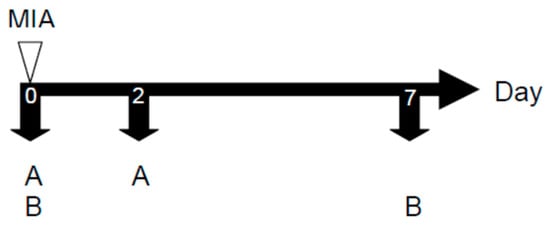 The experimental schedule of mono-iodoacetate (MIA)-induced osteoarthritis model. MIA: first time injected 80 mg/mL MIA, 80 μL. (A) Paw edema measurement; (B) Hind-limb weighting bearing measurement.