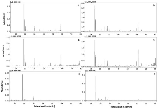 Typical GC-MS total ion current (TIC) chromatograms of Rxi-5MS ((A) HD; (B) MAE; (C) HS) and HP-INNOWAX ((D) HD; (E) MAE; (F) HS).