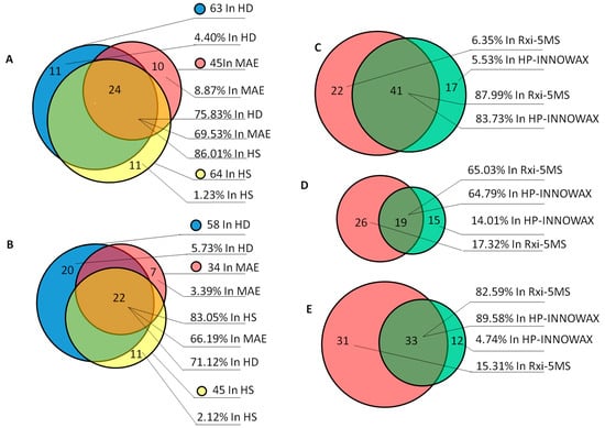Distribution of compounds identified using two columns ((A) Rxi-5MS; (B) HP-INNOWAX) and three extraction methods ((C) HD; (D) MAE; (E) HS).