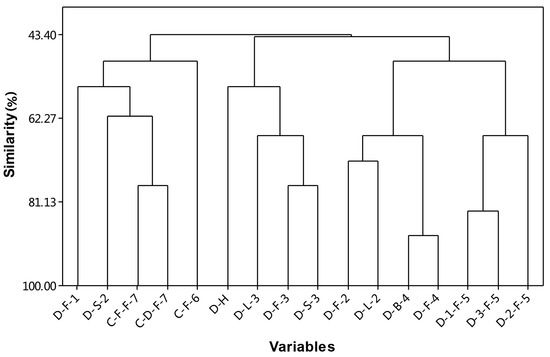 There are remarkable differences in the composition of D. indicum var. aromaticum essential oil between these publications. Therefore, the top ten components from seven representative published reports and the HD analysis results from the present study were selected (Table S2) and a matrix was made, followed by analysis with the maximum likelihood method (Minitab software), as shown in Figure 3. Our analysis demonstrated that there were three main clades, and the similarity ranged from 43.40% to 84.35%.It is interesting to note that D. indicum var. aromaticum and C. indicum are clustered in the same clade (D-S-5, C-F-F-14, C-D-F-14 and C-F-13). Samples were collected at three closely related locations in Hubei Province [4]—Hongping (D-1-F-4), Xingshan (D-2-F-4) and Badong (D-3-F-4)—were clustered into the same clade. The sample used in this study (named D-H) was clustered with D-L-11, D-F-11 and D-S-11, which suggested that these plants had a closely related origin. The essential oil composition of different tissues from the same plant clustered within the same clade (for example, 65.24% similarity between D-L-11, D-F-11 and D-S-11; and 84.35% similarity between D-B-12 and D-F-12). The significant differences between the previous reports as well as our results might be due to differences in the tissues collected, drying method, collection time, growing environment, and the methods of transportation and extraction.