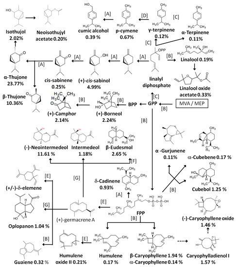 Summary of the biosynthetic pathway of the main monoterpenoids and sesquiterpenesin the D. indicum var. aromaticum essential oil, as identified in the present work. Notes: Dashed lines represent multiple steps; letters on arrows represent references reporting the converting steps. A: [15], B: [16], C: [17], D: [18], E: [19], F: [20], G: [21].Numbers under compound names represent the relative content of the compound in HD oil by GC-MS normalization.