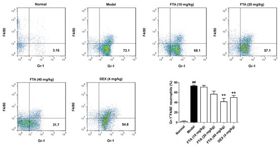 Influence of FTA on the inflammatory response in zymosan-induced peritonitis. Four hours after the injection of the zymosan, cells were extract from the peritoneal lavage fluid. The proportion of neutrophils (Gr-1+F4/80−) was measured by flow cytometry. Data were expressed as means ± SEM (n = 8). ** p < 0.01 vs. Model; ## p < 0.01 vs. Normal.