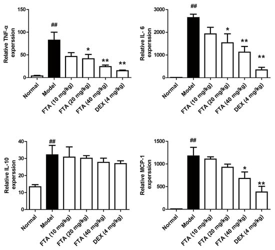 FTA treatment influences cytokines levels in peritoneal cavity. Levels of cytokines (TNF-α, IL-6, IL-10 and MCP-1) were determined by ELISA. Data were expressed as means ± SEM, n = 8. * p < 0.05, ** p < 0.01 vs. Model; ## p < 0.01 vs. Normal.