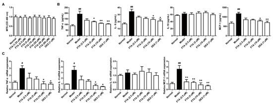 FTA reduces the expressions of cytokines in zymosan-stimulated RAW 264.7 cells. Cells were pretreated with zymosan (10 μg/mL) for 30 min, then treated with FTA (2.5, 5, 10 μM) and DEX (1 μM) for 4 h, and supernatants and total cells were collected. (A) Effect of FTA on the cell viability of macrophage RAW 264.7 cells. Cells were incubated with or without FTA (1.25–80 μM) and DEX (1 μM) for 24 h. Cell viability was determined by MTS; (B) The protein of cytokines were determined by ELISA; (C) Cytokine mRNA levels were quantified by QRT-PCR. Data were expressed as means ± SEM (n = 3). * p < 0.05, ** p < 0.01 vs. Model; # p < 0.05, ## p < 0.01 vs. Normal.