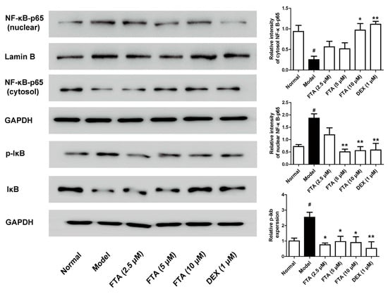 Effect of FTA on NF-κB signaling pathway activation in zymosan-stimulated macrophage RAW 264.7 cells. Cells were treated with FTA or DEX in the presence or absence of zymosan (10 μg/mL). NF-κB-p65 and IκB expression were detected by Western blotting. Data were expressed as means ± SEM (n = 3). * p < 0.05, ** p < 0.01 vs. Model; # p < 0.05 vs. Normal.