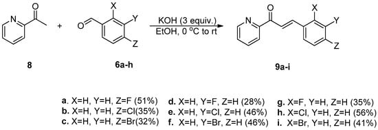 Azachalcones 9a–i were synthesized from 8 and corresponding 6a–h (Figure 4) as reported recently [33]. The structures of synthetic chalcones 7a–i and azachalcones 9a–i are listed in Figure 5. The 1H and 13C NMR data for compounds 7a–i and 9a–i are available as supporting materials.