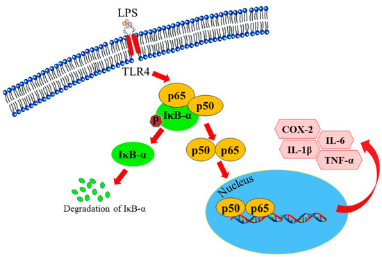 Inflammation is one of the pathologic processes that contribute to disorders. It involves complex signal transduction pathways and the production of various pro-inflammatory factors. Mammalian toll-like receptors (TLRs) are transmembrane receptors that recognize microbial infection and trigger innate immune responses [34]. TLR4 is primarily expressed in macrophages. Binding of lipopolysaccharide (LPS) to TRL4 initiates several signal transduction pathways, including NF-κB [35]. NF-κB is a heterodimer consisting of p65 and a p52 or p50. In cytoplasm, inactivated NF-κB binds with IκB-α. Phosphorylation of IκB-α results in the dissociation of NF-κB from IκB-α, allowing the translocation of heterodimer into the nucleus and binding to the promoters of pro-inflammatory genes, such as interleukine (IL)-1β, IL-6, tumor necrosis factor (TNF)-α, and cyclooxygenase (COX)-2 (Figure 6).