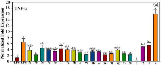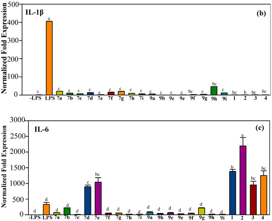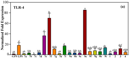 mRNA expression of (a) TLR-4, (b) IL-1β, and (c) IL-6. RAW 264.7 cells were pre-treated with synthetic or natural compounds (10 μg/mL) for 1 h before induction of inflammation by LPS (1 μg/mL) for 6 h. Values indicate means ± SD. Bars with the same letters are not significantly different (α = 0.05). LPS: lipopolysaccharide; 7a–i are synthetic halo-substituted chalcones; 9a–i are synthetic halo-substituted azachalcones; 1–4 are synthetic natural products.
