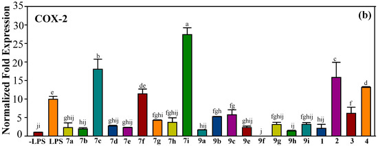 mRNA expression of (a) TNF-α and (b) COX-2. RAW 264.7 cells were pre-treated with synthetic or natural compounds (10 μg/mL) for 1 h before induction of inflammation by LPS (1 μg/mL) for 6 h. Values indicate means ± SD. Bars with the same letters are not significantly different (α = 0.05). LPS: lipopolysaccharide; 7a–i are synthetic halo-substituted chalcones; 9a–i are synthetic halo-substituted azachalcones; 1–4 are synthetic natural products.