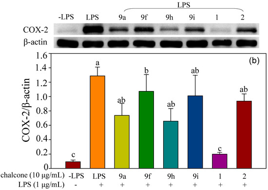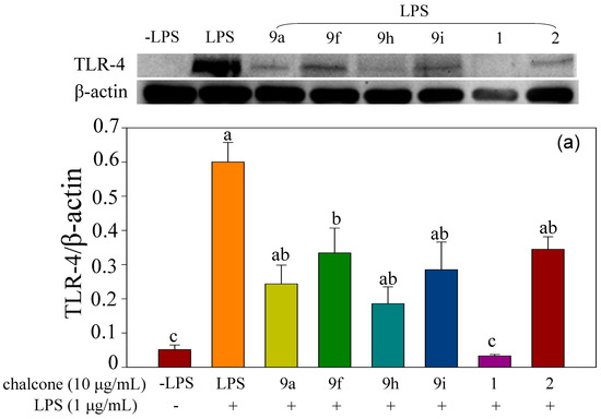 Protein expression of (a) TLR4 and (b) COX-2. RAW 264.7 cells were pre-treated with synthetic halo-substituted azachalcones 9a, 9f, 9h, 9i or natural synthetic compounds 1 or 2 (10 μg/mL) for 1 h before induction of inflammation by LPS (1 μg/mL) for 6 h. Values indicate means ± SD. Bars with the same letters are not significantly different (α = 0.05). LPS: lipopolysaccharide.