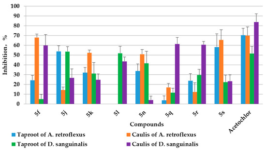 The herbicidal activities of the 21 title compounds of 20 mg·L−1 and 100 mg·L−1 against the taproot and caulis growth of dicotyledonous weed A. retroflexus and monocotyledonous weed D. sanguinalis were assayed. The inhibition of the compounds with effectiveness of greater than 50% to at least one organ of the test weeds at 100 mg·L−1 are displayed in Figure 2. It indicates that compounds 5j and 5s show medium inhibition against the taproot growth of A. retroflexus, and compounds 5f, 5s, 5k and 5n show medium to high inhibition against the caulis growth of A. retroflexus. Moreover, compounds 5j and 5l show medium inhibition against the taproot growth of D. sanguinalis, and compounds 5f, 5q, and 5r show medium inhibition against the caulis growth of D. sanguinalis. Furthermore, the herbicidal activities of 5f against the caulis of A. retroflexus, 5j and 5l against the taproot of D. sanguinalis are equivalent to the commercial herbicide Acetochlor. It also shows that only compounds 5j and 5s are both active to the two test herbs; the other compounds display certain selectivity between the test herbs. Contrary to the fluorescence, the phenyl substituted compounds show higher herbicidal activity than the alkyl substituted compounds except compound 5f substituted by cyclopentyl. All the compounds substituted by phenyls with chlorine (5j–5l) exhibit better activity. Compounds 5o (3-CH3Ph-), 5r (2-CH3OPh-) and 5s (3-CH3OPh-) substituted by phenyls with electron donating groups are more active.