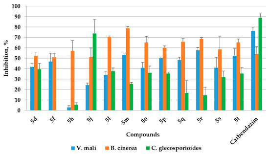 The in vitro antifungal activities of the title compounds of 20 mg·L−1 and 100 mg·L−1 against the mycelium growth of the phytopathogens Valsa mali, B. cinerea, Colletotrichum glecosporioides, and Fusarium oxysporum were assayed. The inhibition of the synthesized compounds with effectiveness of greater than 50% at 100 mg·L−1 are exhibited in Figure 3. This indicates that more compounds exhibit stronger inhibition against B. cinerea than the other three plant disease fungi (the inhibitory rates of all the title compounds against F. oxysporum are less than 50%, and they do not appear in Figure 3). There are only four title compounds showing medium inhibition against V. mali, and only one compound having an inhibitory rate of more than 50% to C. glecosporioides. Meanwhile, 12 of the title compounds exhibit medium to high activity against B. cinerea, and nine of them are more antifungal than the commercial fungicide Carbendazim. Based on the above description, it seems that the phenyl substitutes are of more benefit to the antifungal activity. Compounds 5j, 5l, and 5o–5t with substitutes of –Cl, –CH3, –CF3, or –OCH3 on phenyls have more potential.