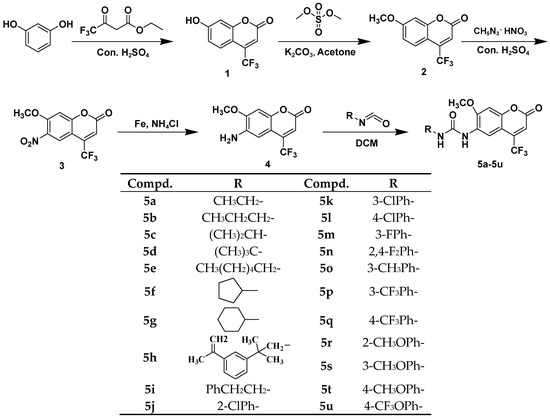 The synthesis of target compounds was carried out according to Scheme 1. Compound 1 was prepared from the reaction of resorcinol with ethyl trifluoroacetoacetate catalyzed by Con. (concentrated) H2SO4. Compound 2 was synthesized by methylation of compound 1 with dimethyl sulfate using anhydrous K2CO3 as catalyst in acetone. Compound 3 was synthesized by nitration of compound 2 with guanidine nitrate in Con. H2SO4. Compound 4 was obtained by reduction of compound 3 with Fe powder in aqueous solution of NH4Cl. The target compounds 5a–5u were furnished by addition of compounds 4 to a series of isocyanates catalyzed by triethylamine in CH2Cl2 (DCM). The structures of all target compounds were well characterized by 1H-NMR, 13C-NMR, and HR-ESI-MS. The spectrograms were listed in the supplementary materials.
