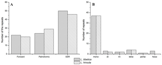 Simple sequence repeats (SSRs) are another important type of repeated sequence in genomes that are particularly useful molecular markers in genetic diversity research. A total of 50 perfect microsatellites, 574 bp in length, were detected in L. tibetica chloroplast genome, and there were 37, 3, 2, 4, 1, and 3 mono-, di-, tri-, tetra-, penta- and hexa-nucleotides repeats, respectively (Table S5). In L. hirsuta, the 46 SSRs with totally 496 bp in length included 37, 2, 2, 4, and 1 mono-, di-, tri-, tetra-, and penta-nucleotide repeats, respectively (Table S6). No hexa-nucleotide repeats were found in L. hirsuta. Most SSRs were located in non-coding regions, especially in the LSC region. AT content comprised 86% and 87% of SSRs in L. tibetica and L. hirsuta, respectively.