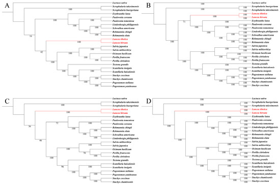 Figure 6. Phylogenetic trees of 24 species based on complete chloroplast genomes and 75 protein-coding genes. (A) Maximum likelihood (ML) phylogenetic tree constructed with complete chloroplast genomes; (B) Bayesian inference (BI) phylogenetic tree constructed with complete chloroplast genomes; (C) ML phylogenetic tree constructed with 75 protein-coding genes; (D) BI phylogenetic tree constructed with 75 protein-coding genes. The Lancea species are shown in red.