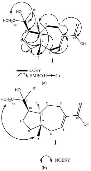 Compound 1 was isolated as an amorphous white powder and exhibited an [M − H]− ion peak at m/z 267.1591(calcd. for C15H23O4, 267.1596) in the negative HRESIMS. This corresponds to a molecular formula of C15H24O4 (four degrees of unsaturation). Its infrared (IR) spectrum showed absorbance of a hydroxyl and conjugated carboxylic acid groups (νmax 3300–2300 and 1690 cm−1). The 1H-NMR data revealed two methyl groups (δH 0.80 (s), H-15, and δH 1.10 (s), H-13), an oxygenated methylene (δH 3.28 (d, J = 10.4 Hz), 3.33 (d, J = 10.4 Hz), H-12), and one olefinic proton, δH 7.10 (m, H-5). The 13C NMR data (Table 1) showed 15 resonances, including one conjugated carboxyl carbon (δC 169.6), two olefinic carbons (δC 136.4, 142.2), and two oxygenated carbons (δC 75.9, 70.9). Only two degrees of unsaturation were observed from the 13C-NMR data. Accordingly, there were two degrees of unsaturation remaining, which suggested the presence of two rings. The 2D experiments (COSY and HMBC spectra of 1) (Figure 2a) were used to determine the oxygenated and olefinic functionality of 1. The HMBC of 1 showed correlations from H-13 (δH 1.10) to C-10 (δC 48.6), C-12 (δC 70.9), and C-11 (δC 75.9); H-9 (δH 1.78) to C-1 (δC 58.0), C-7 (δC 42.7), and C-8 (δC 42.4); H-1 (δH 1.99) to C-15 (δC 19.7), C-2 (δC 24.2), C-3 (δC 30.9), C-8 (δC 42.4), C-7 (δC 42.7), and C-11 (δC 75.9); H-15 (δH 0.80) to C-8 (δC 42.4), C-7 (δC 42.7), C-6 (δC 43.3), and C-1 (δC 58.0); H-5 (δH 7.10) to C-7 (δC 42.7), and C-14 (δC 169.6); and H-3 (δH 3.08) to C-1 (δC 58.0), olefinic carbons (δC 136.4, 142.2), and carboxylic acid C-14 (δC 169.6). In addition, there were 1H–1H COSY correlations between H-2/H-3 and H-5/H-6. Therefore, carboxylic acid moiety is postulated to be attached to C-4. The NOESY experiment demonstrated the correlations from bridgehead methyl (δH 0.80, H-15) to methylene hydroxyl group (δH 3.28, 3.33, H-12) and H-1 (δH 1.99) to H-10 (δH 2.59) (Figure 2b), which is an indication that they are in the same phase. Thus, the relative configuration structure of 1 was determined to be 11,12-dihydroxyisodaucenoic acid.