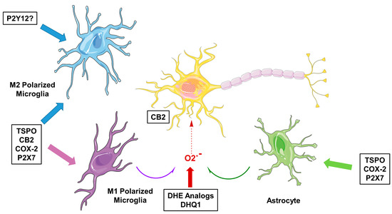 Molecular targets for imaging neuroinflammation in neurodegeneration. TSPO = translocator protein 18 kDa; CB2 = cannabinoid receptor type 2; COX-2 = cyclooxygenase-2; DHE = dihydroethidium; DHQ1 = dihydroquinoline analog.