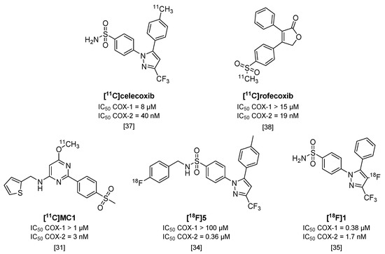 An 18F-labeled analog of celecoxib ([18F]5; Figure 3) [34] was evaluated in colorectal cancer cells in vitro, but uptake of the tracer could not be blocked with either celecoxib or rofecoxib. Although [18F]5 showed increased selectivity for COX-2 over COX-1 (IC50 > 100 µM) compared with celecoxib, its IC50 value for COX-2 also decreased to 0.36 µM, which might explain the non-selectivity in blocking experiments. In addition, although [18F]5 was metabolically stable, the tracer was quickly cleared in vivo in COX-2 expressing tumor-bearing mice, which resulted in a lack of uptake in the tumor compared with the uptake observed in vitro, and is therefore not a suitable candidate for COX-2 imaging studies [34]. Another metabolically stable 18F-labeled analog of celecoxib, [18F]1 (IC50 COX-2 = 1.7 nM; IC50 COX-1 = 0.38 µM [35]), was obtained via the non-standard route of electrochemical radiofluorination [36] to attach the fluorine-18 atom to the pyrazole ring (Figure 3). Although this led to low yields (2% radiochemical yield) and low molar activity (~110 MBq/µmol), [18F]1 could be a valuable COX-2 radiotracer in vivo, once, as indicated by the authors, an efficient radiosynthesis method is identified, given its good in vitro affinity, and high metabolic stability in mice (>95% intact tracer at 60 min p.i. in blood), and its high brain uptake (2% ID/g in mouse brain at 60 min p.i.).