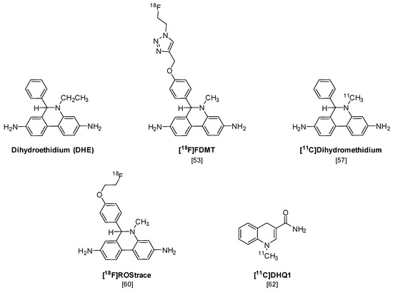 A number of radiolabeled analogs of dihydromethidium (a.k.a. hydromethidine), which is the corresponding N-methyl analog of DHE, have been synthesized and evaluated in vitro and in vivo [56,57]. [3H]Dihydromethidium is oxidized by both superoxide and hydroxyl radicals and has been evaluated in animal models of stroke and cisplatin-induced nephrotoxicity [58,59]. A recent paper has also reported the radiosynthesis and preliminary in vivo evaluation of [11C]dihydromethidium [57]. This compound shows high brain uptake in microPET imaging studies, but a detailed analysis of the mechanisms of uptake and trapping of this radiotracer was not conducted.