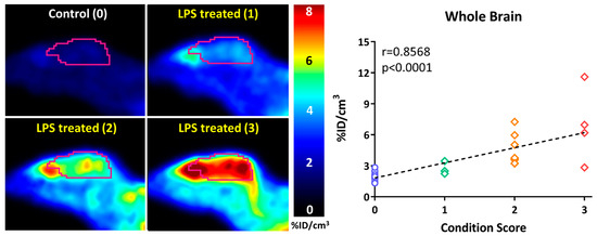 The uptake of [18F]ROStrace correlates with the condition score (degree of “sickness”) following treatment with lipopolysaccharide (LPS).