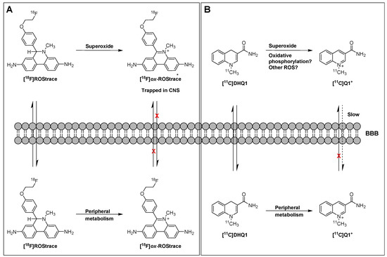 Mechanism of trapping of [18F]ROStrace (A) and [11C]DHQ1 (B).