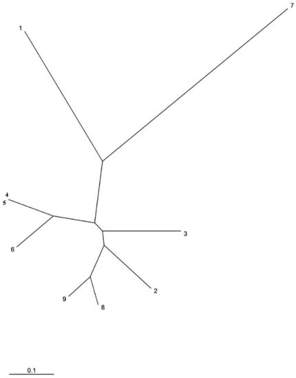 - Page, R.D.M. TreeView: An application to display phylogenetic trees on personal computers. Comput. Appl. Biosci. 1996, 12, 357–358. [Google Scholar] [PubMed]