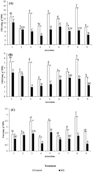 - Li, R.; Guo, P.; Baum, M.; Grando, S.; Ceccarelli, S. Evaluation of chlorophyll content and fluorescence parameters as indicators of drought tolerance in barley. Agric. Sci. China 2006, 5, 751–757. [Google Scholar] [CrossRef]