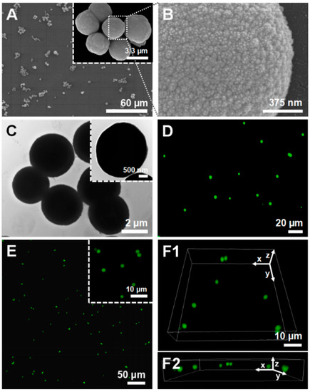 (A,B) SEM, (C) TEM, (D) FL microscopy and (E,F) CLSM micrographs of the uncoated CaCO3 microparticles prepared at room temperature. (B) The SEM micrograph shows the high surface roughness and the porous structure of the microparticles. (D) FL microscopy and (E,F) 3D reconstructed CLSM micrographs were acquired by loading the CaCO3 core microparticles with FITC (green channel). F1 and F2 correspond to the upper (xy) and lateral (xz) views, respectively.
